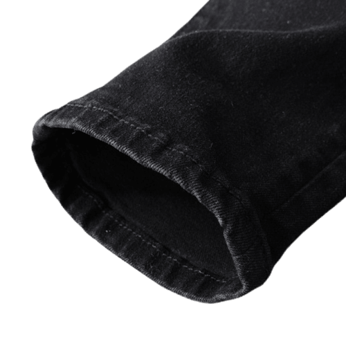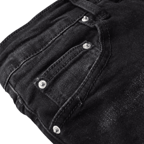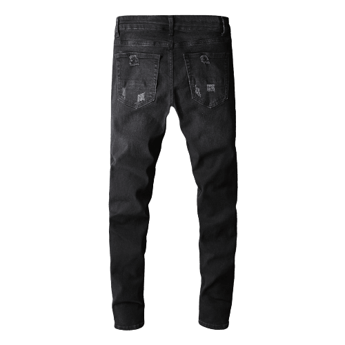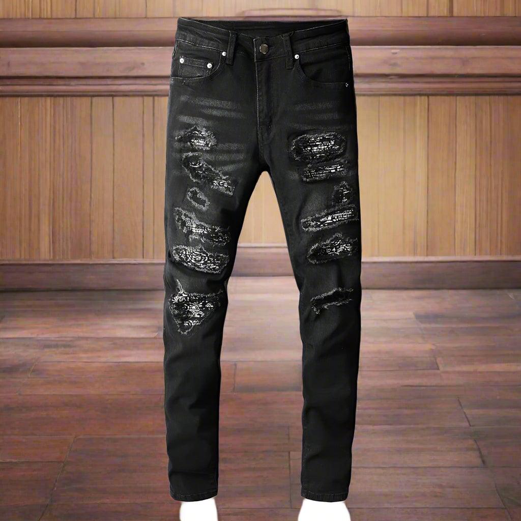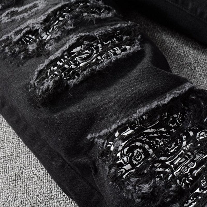 Eleva tu estilo urbano con nuestros jeans rasgados con bandana negra. Estos jeans atrevidos y de moda presentan un toque único con parches inspirados en pañuelos y detalles desgastados. Confeccionados para brindar comodidad y estilo, son una declaración de moda audaz. Adopte el look urbano chic y salga con confianza con estos jeans llamativos.