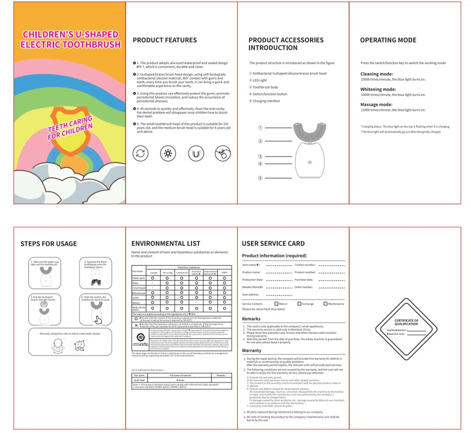 ¡Te presentamos el cepillo de dientes eléctrico Kids, el cepillo de dientes perfecto para tus pequeños! Este cepillo de dientes cuenta con silicona de calidad alimentaria que es suave y respetuosa con las encías, así como dos tipos de cabezales de cepillo para adaptarse a niños de diferentes edades. Los modos de limpieza están diseñados para satisfacer las necesidades de diferentes períodos, con opciones para modo de masaje, modo suave, modo de limpieza, modo de protección de encías y limpieza profunda. Además, este cepillo de dientes cuenta con limpieza sónica de levitación magnética y un motor de suspensión magnética de eje corto para un peso liviano y una distancia entre ejes corta que es perfecto para los niños. También tiene una función de carga rápida USB para que puedas cargarlo en solo 2 horas y también es resistente al agua con una clasificación IPX7.