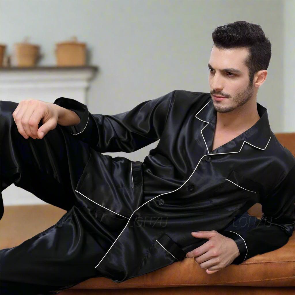 Looking for the ultimate loungewear set that offers comfort, style, and luxury? Look no further than our Men's Sleepwear Pajamas Set! Crafted with a luxurious blend of silk satin and polyester for a truly ultra-soft feel, and designed to fit perfectly, these pajamas are sure to become a staple in your wardrobe. With a timeless design that is suited for all seasons, the contrast-trimmed collar with button-up style and long sleeves makes it easy to look stylish even when relaxing. Whether you're in your home office or catching some Z's, you'll look and feel your best wearing our Men's Sleepwear Pajamas Set.
