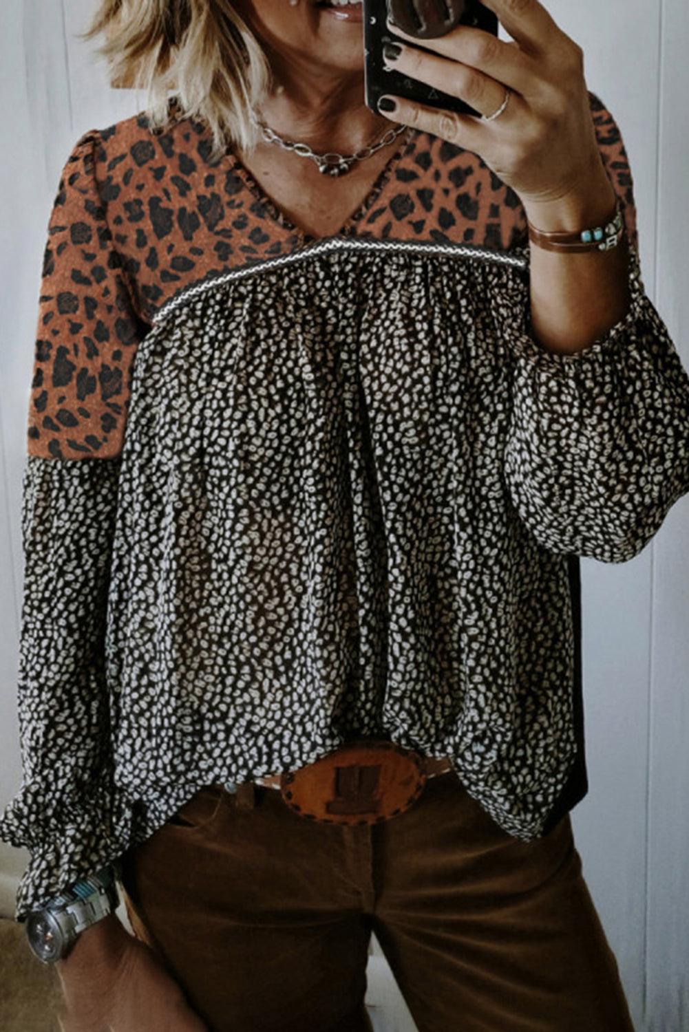¿Buscas un top que te haga destacar del resto? ¡Echa un vistazo a nuestra camiseta de manga larga con retales! Este top único presenta un canesú de leopardo y mangas abullonadas empalmadas con florecitas. Confeccionado con un tejido ligero y sedoso, es cómodo de llevar y perfecto para un día informal. ¡Con este top, lucirás hermosa y te sentirás segura!