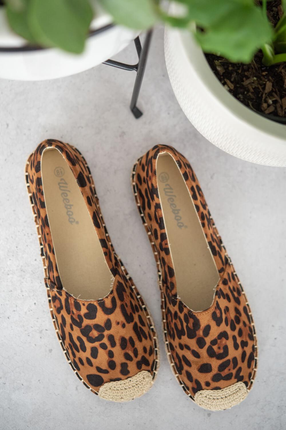 El estampado de leopardo crea un look veraniego divertido en estos zapatos planos sin cordones. La parte superior del zapato es de lona, con suela y puntera de yute. Póntelos con tus pantalones cortos recortados y una camiseta sin mangas para una apariencia sin esfuerzo.