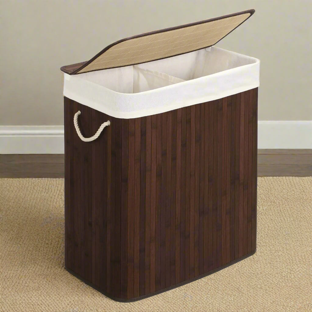 [[Lid & Wide Bamboo Strips] The lid of this laundry hamper can be opened and closed with one hand effectively trapping odors and keeping dust away. Crafted with robust 0.7" bamboo strips this durable and stable basket has a max. load capacity of 55 lb [Large 21.99 Gallons (100L Capacity] Sized at 20.3"L x 12.4"W x 24.2"H with a capacity of 21.99 gallons (100L) this laundry basket easily accommodates a week\s worth of dirty clothes towels sheets and more for the entire family [Divided 2-Section Storage] With 2 divided sections this laundry hamper with a lid enables you to sort light dark and colored laundry for hassle-free washing and storage [Removable & Washable Liner] The liner is made of soft and breathable 160g/m² poly-cotton blend fabric giving your laundry a cozy place to rest. The removable liner allows easy machine washing to keep your laundry storage space clean [Easy to Carry and Assemble] With cotton rope handles on each side this laundry hamper is easy to move around. The minimalist design along with clear assembly instructions makes it a breeze to assemble]