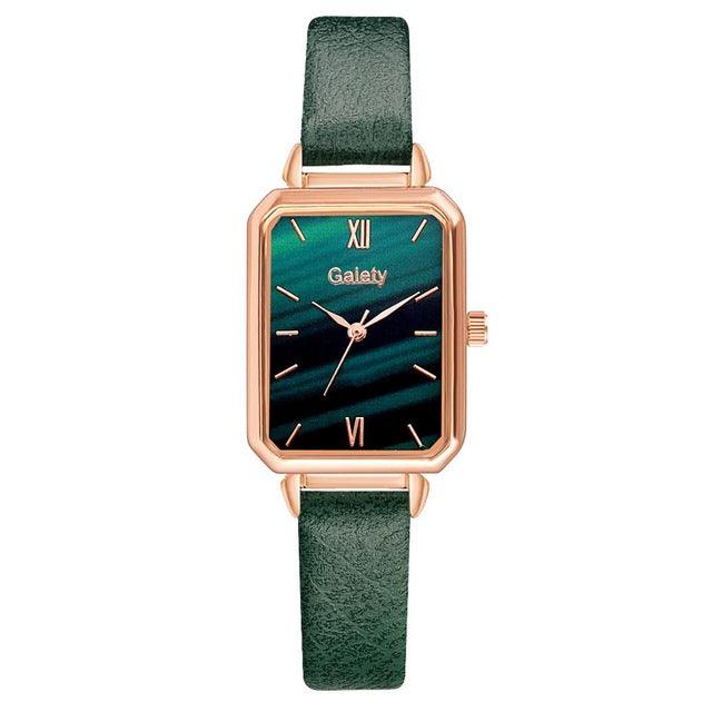 Nuestro Reloj Cuadrado de Cuarzo es el accesorio perfecto para cualquier mujer que ama la moda y la sencillez. El material de la superficie es vidrio, mientras que la caja y la correa están hechas de aleación, lo que le da una apariencia y sensación de lujo. El ancho de la correa es de 10 mm y la longitud es de 270 mm, lo que la convierte en el tamaño perfecto para cualquier muñeca. El grosor de la caja es de 8 mm y el diámetro es de 24 mm. El peso del reloj es de 26 gy el peso de la pulsera es de 7 g. Este reloj está disponible en esfera verde con detalles de malla en oro rosa.