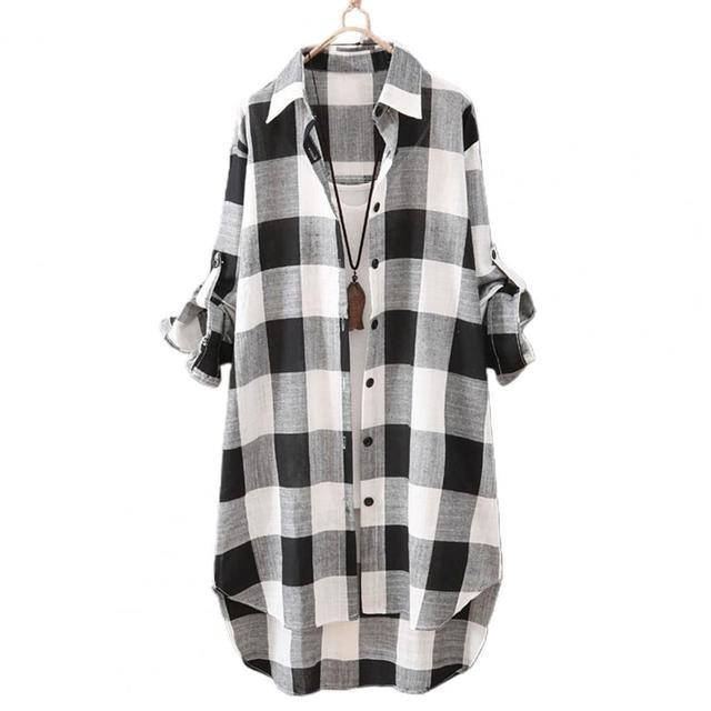 Specifications: Item Name: Sunscreen ShirtMaterial: PolyesterStyle: FashionGender: WomenSeason: AutumnSize Type: RegularCollar Type: Turn-down CollarSleeve Length: Long SleeveShirt Length: Mid-LengthFeatures: Plaid Print, Arc Hem, Loose