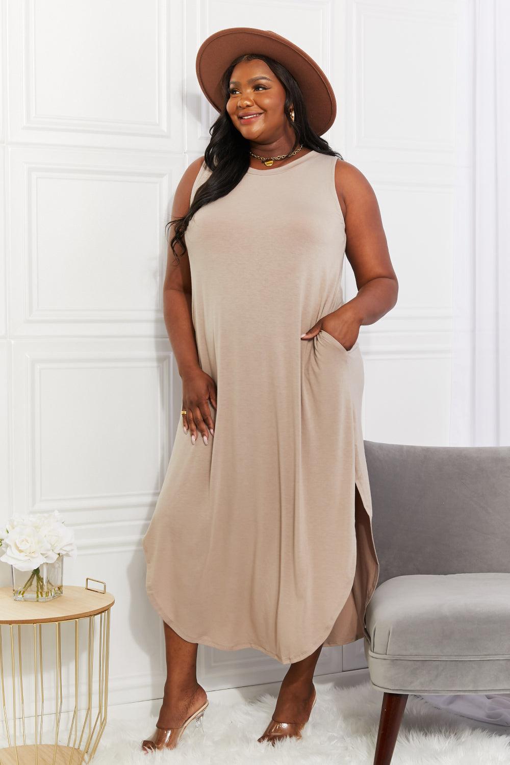 Eleva tu estilo sin esfuerzo con el vestido largo Zenana de talla grande, un básico versátil para tu guardarropa que combina a la perfección comodidad y elegancia. Este vestido largo cuenta con un dobladillo elegantemente curvado, realzado por una elegante abertura y prácticos bolsillos, lo que lo convierte en una opción práctica y elegante. El diseño sin mangas permite opciones de estilo versátiles: úselo solo para una apariencia fresca y relajada, combínelo con su ropa exterior favorita o sea creativo combinándolo con un top con mangas divertidas debajo. Aprovecha la versatilidad y el atractivo atemporal de este vestido largo, una incorporación imprescindible a tu repertorio de moda.