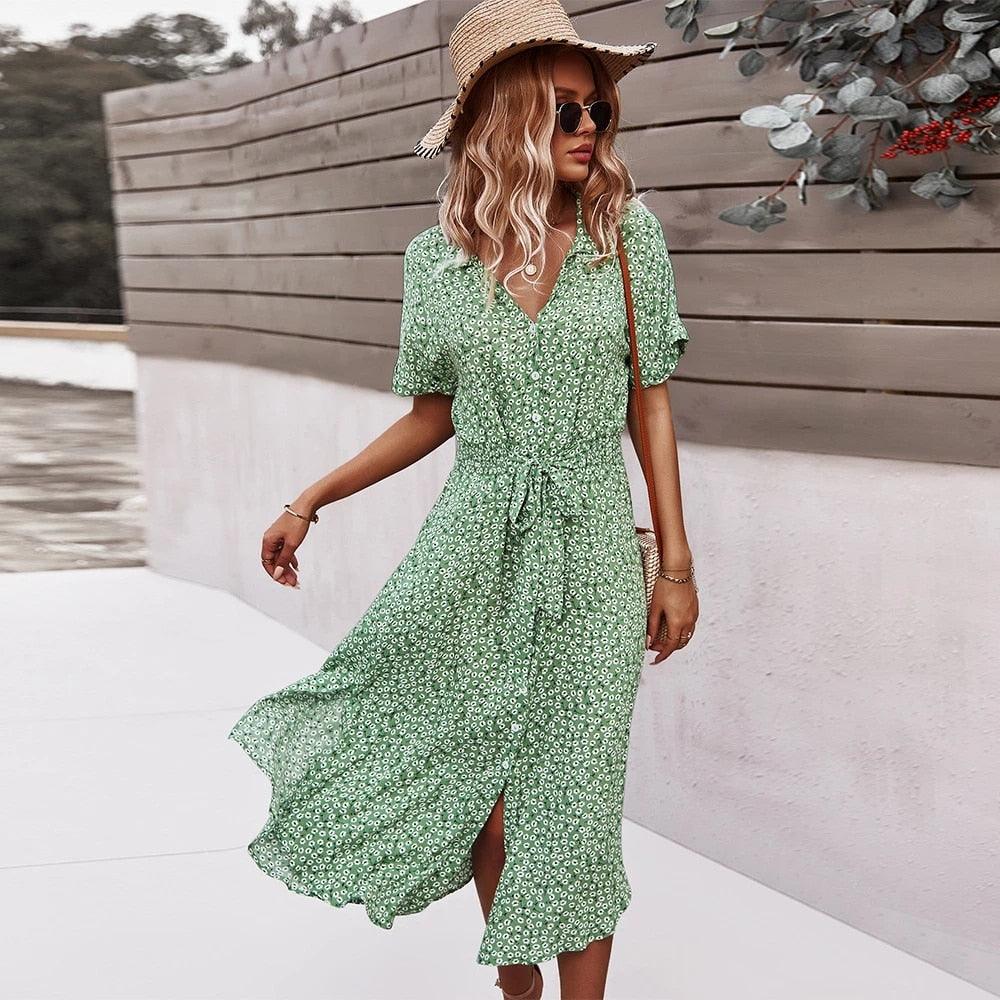 Looking for a versatile, stylish dress that you can wear for any occasion? Look no further than the Midi Dress with Buttons Anne from our online store. This printed polyester dress comes with a belted waist and buttons for a chic, polished look. The short sleeves make it perfect for warm weather, while the timeless design means you can wear it again and again. Whether you're headed to the office or an evening out, this dress is sure to turn heads.