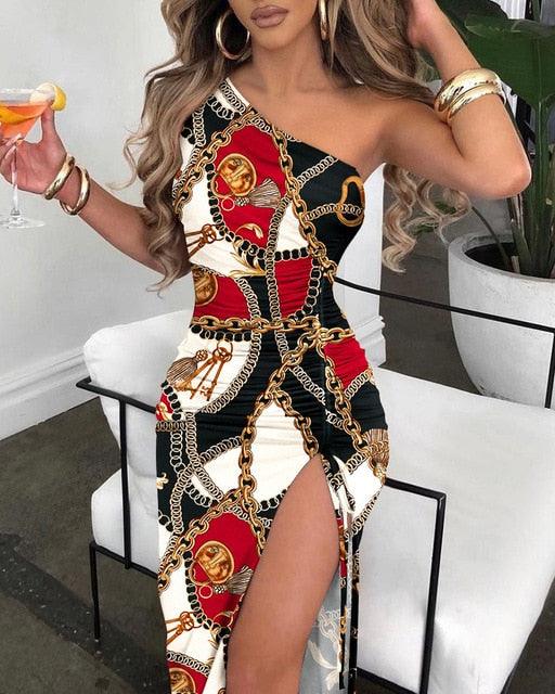 Looking for the perfect summer dress? Look no further than this V-Neck Chain Décor High Slit Dress! Made from a lightweight and breezy material, this dress is perfect for those hot summer days. The V-neck and chain detail add a touch of glamour, while the high slit ensures you'll turn heads when you walk by. Whether you're headed to the beach or a summer party, this dress is sure to have you looking your best. So don't wait any longer, order your V-Neck Chain Décor High Slit Dress today!